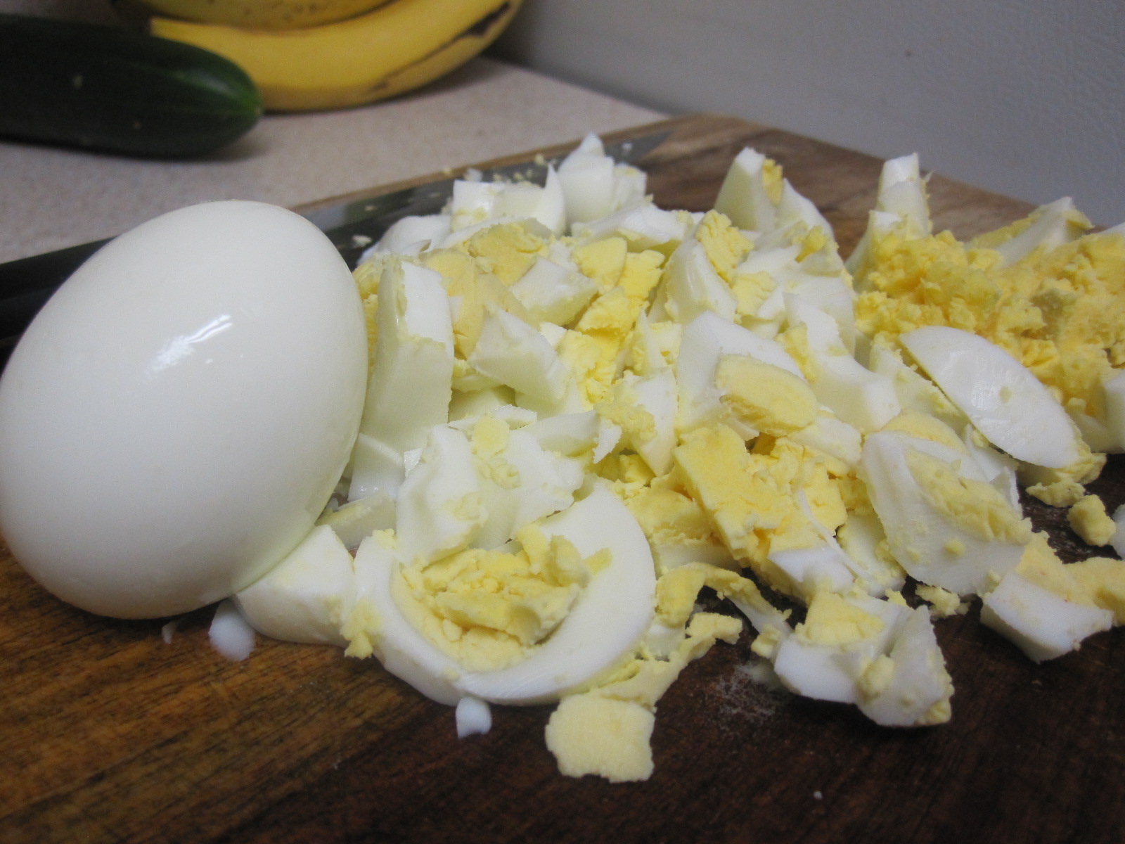 5. Hard boil 5 eggs, then remove shells, chop eggs and layer in bowl. Out of the 5 eggs I boiled, I only managed to remove the shell from one egg without major ugly issues.
