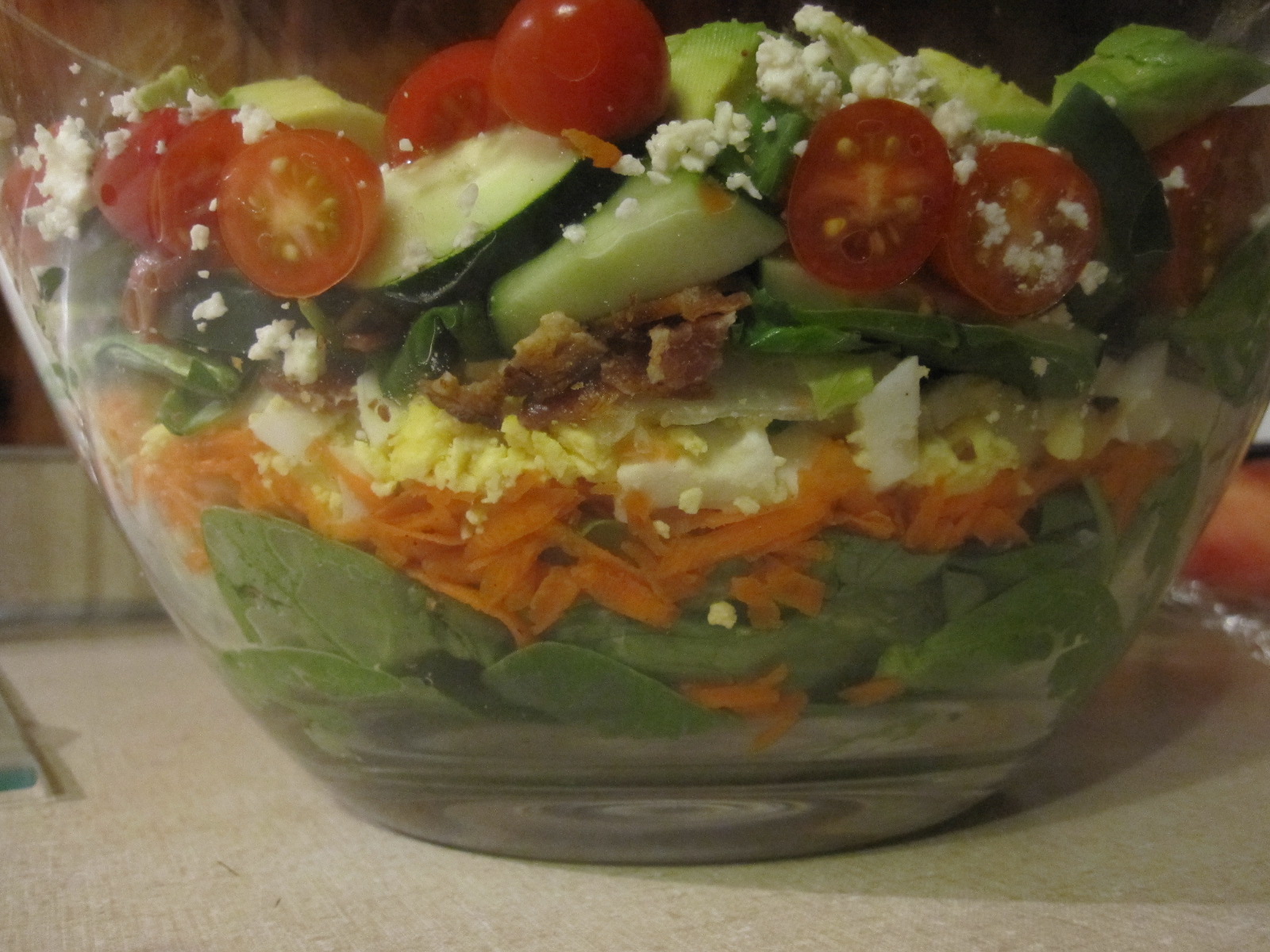 So when our friends Chad and Kellie invited us over for a night of grilling out and cards, we jumped at the chance to be low-key and social. We agreed that each couple should provide a meat for grilling and a side. Chad and Kellie supplied seasoned chicken and cauliflower mash, while I brought burgers and stacked salad. And for a surprise dessert, I concocted a paleo raspberry crumble, which I’ll fill you in on tomorrow.