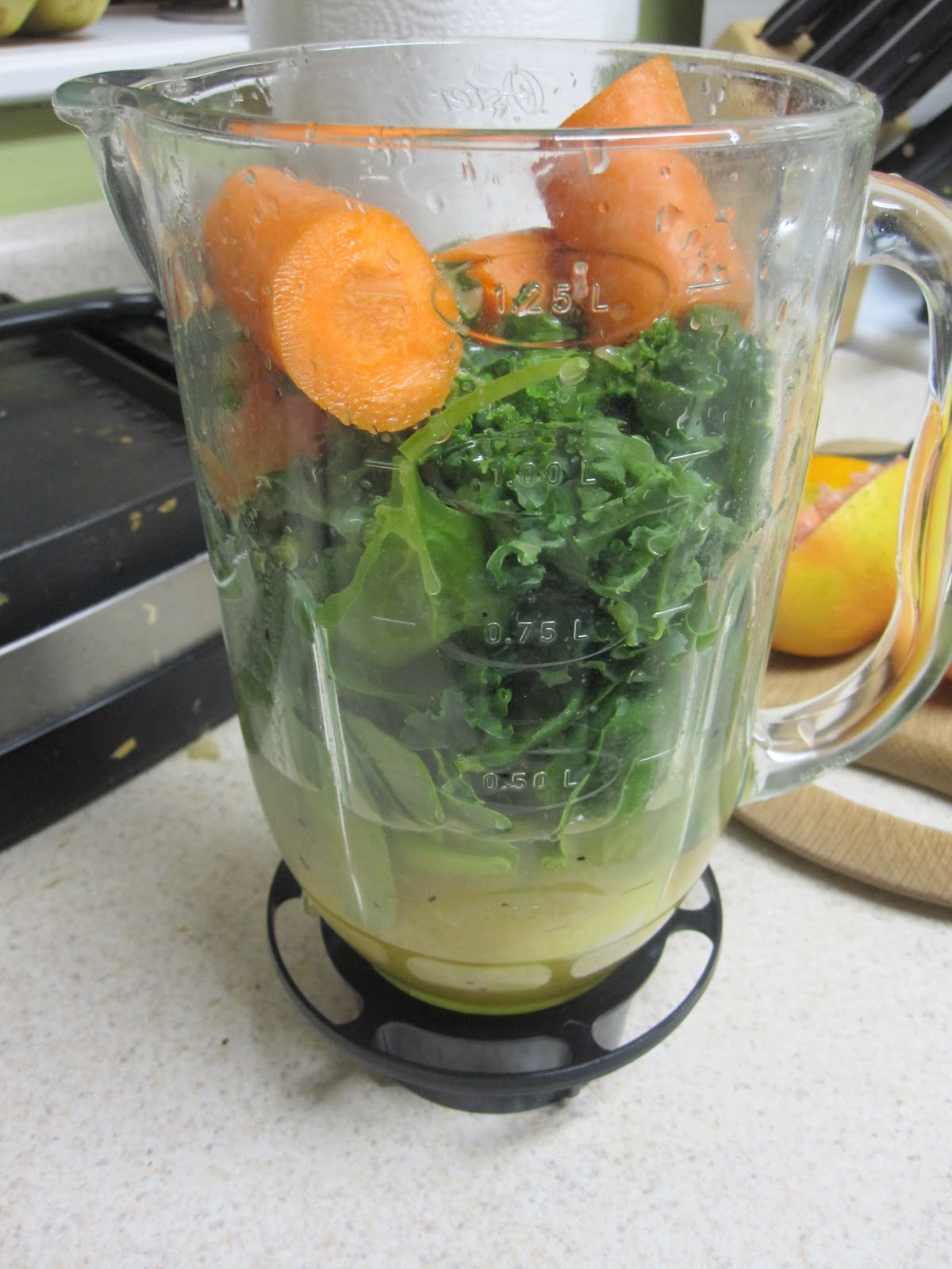 1. Choose your ingredients and place in blender recepticle. For us, this mainly depends on what we have in stock, but most any fruits and veggies will do. Though I’ll warn you, brocolini tastes bitter and should be avoided. We often use carrots, spinach and kale with fruit such as strawberries and a banana.