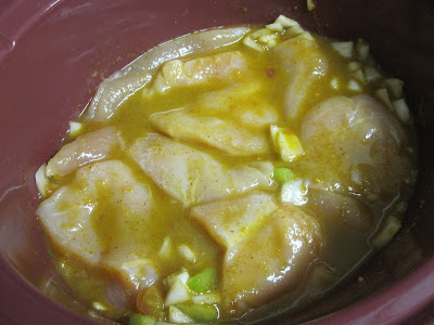 2. Turn crockpot on high and place chicken breast halves on top of mixture. Be sure to push them down a bit in the mixture so that they’re basted with liquid.