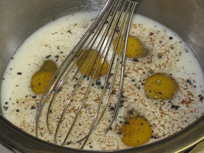 5. In the meantime, whisk eggs, milk, salt, pepper and nutmeg in medium mixing bowl.