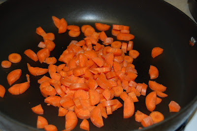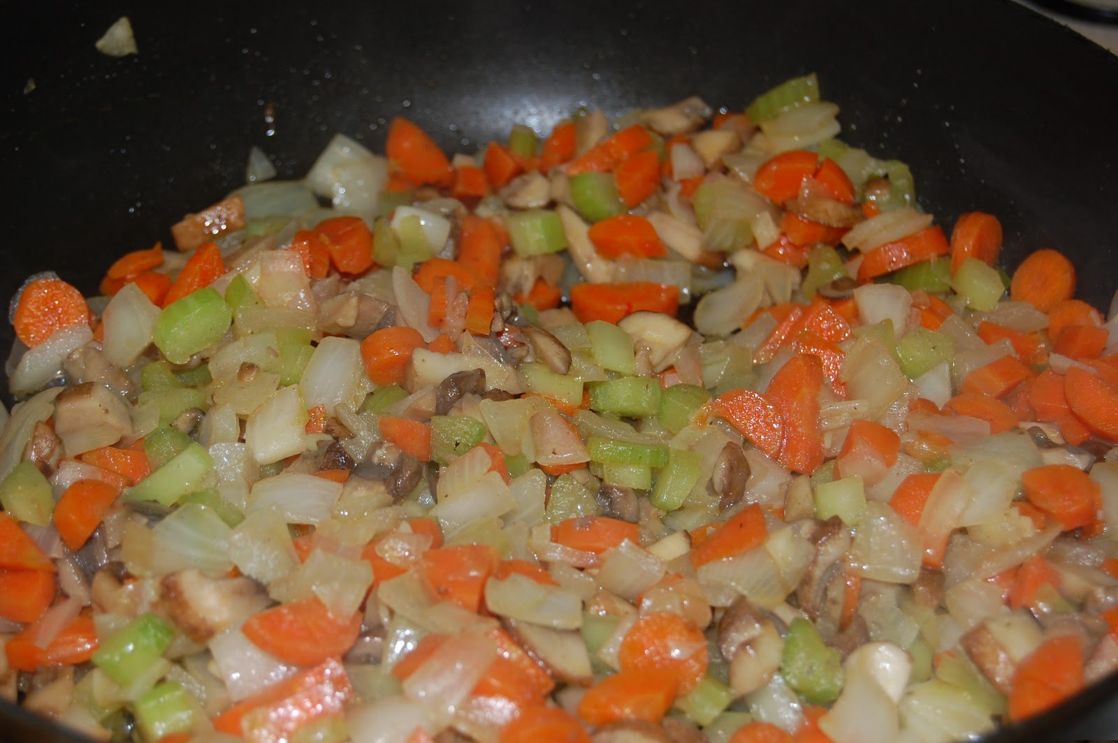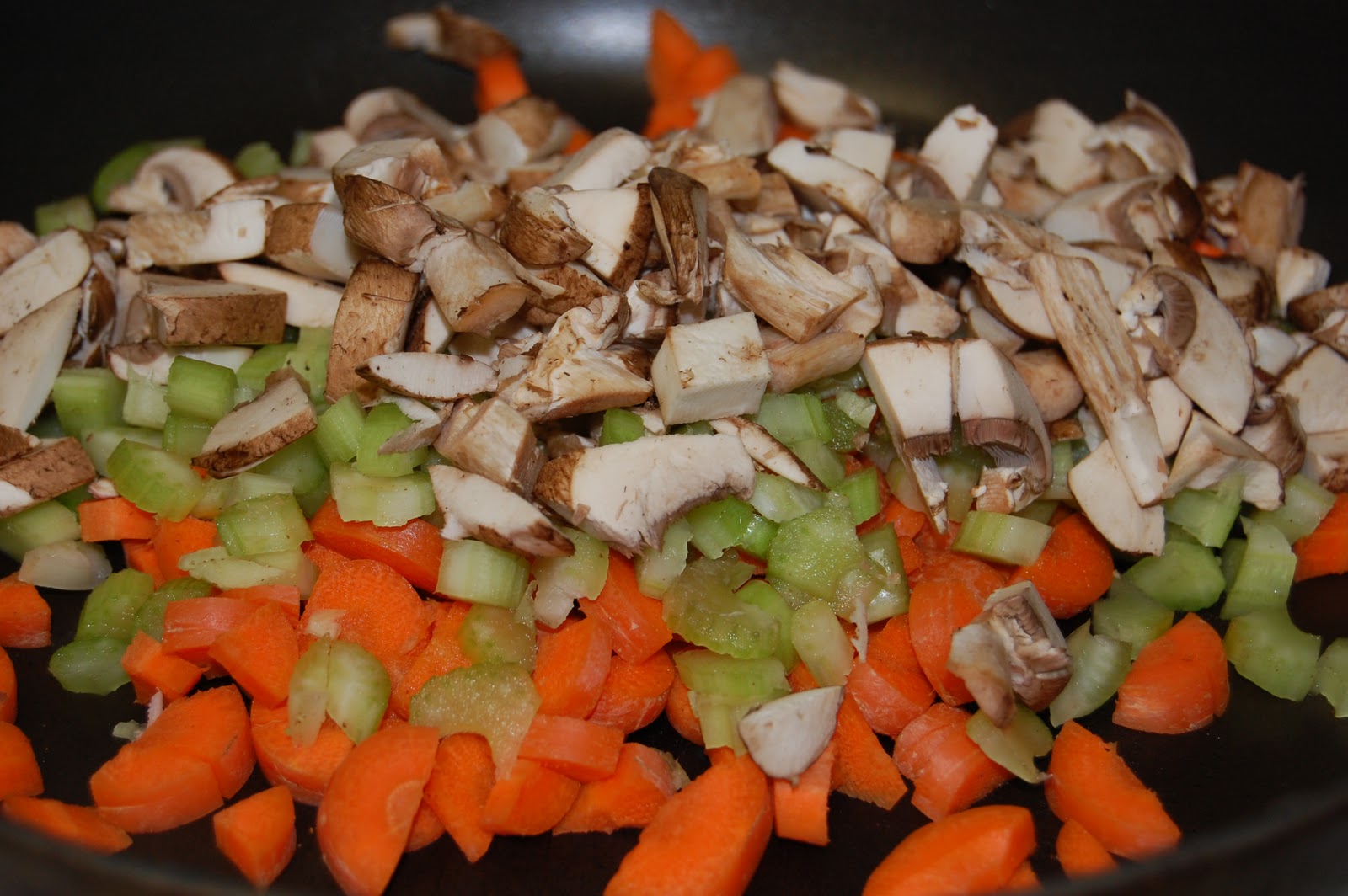 2. Meanwhile, dice carrots, celery, mushrooms and onions, and place in sauté pan along with olive oil.