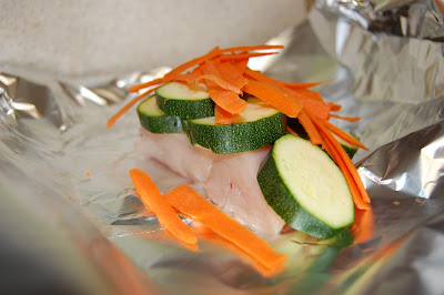Basically, I just trimmed chicken breasts, placed them on sheets of tinfoil and covered with sliced zucchini. I didn’t have squash, so I decided to use carrots instead.