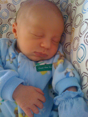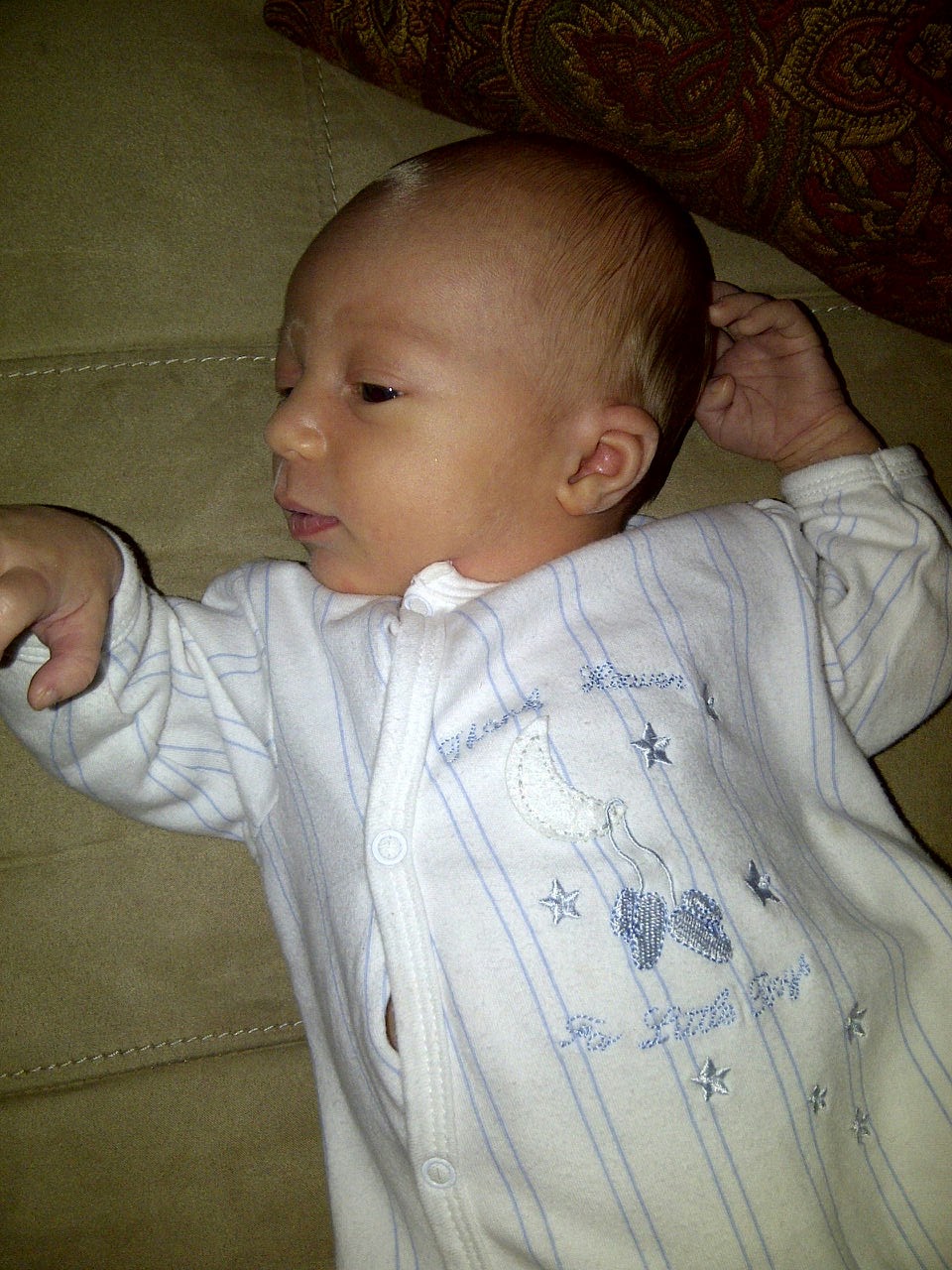 Speaking of his appetite, when we went for his 48-hour appointment two weeks ago, he weighed in at 6 lbs 15 oz (he was 7lbs when he left the hospital the day before). The pediatrician told us that the goal for his two-week appointment was for him to be back up to his birth weight of 7 lbs 6 oz.