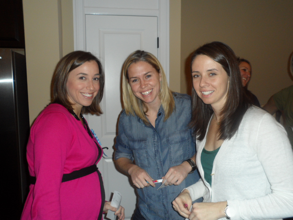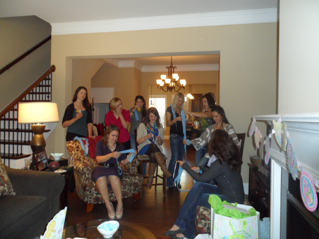 The last game involved guessing the circumference of my belly. Thankfully, we didn’t use a measuring tape. Instead, the girls approximated my belly size by tearing off a section from a roll of blue streamer. Then, I went around to each girl to see who guessed closest. I’m not sure how my friends perceive me–apparently huge! Most had 5 or 6 inches extra in length, and some friends (not to be named) had more than 12 inches of extra streamer! Ha. It was a hilarious game.