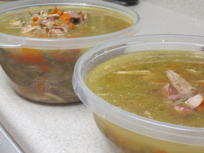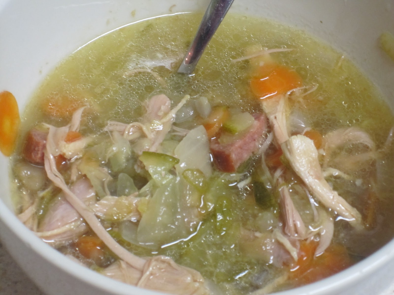 What did he use to make it? Pulled turkey, turkey stock, carrots, celery, onions, mushrooms, zucchini and spicy kielbasa. Great comfort food for a week of sub-freezing temps.